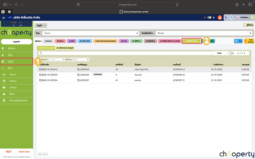 เลือก "บัญชี" >> เลือก "ค้างชำระ" >> เลือก "สัญญาเช่า" ที่ต้องการรับชำระ